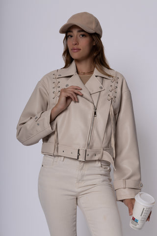 Giacca ecopelle con lacci incrociati su fronte